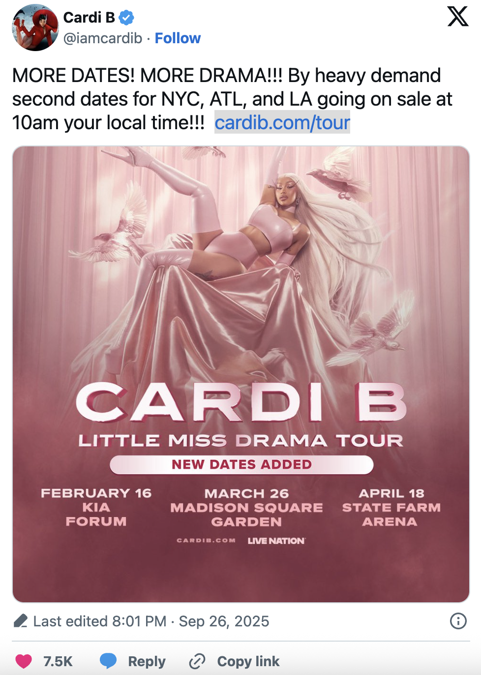 Cardi B’s “Little Miss Drama Tour” 2026 dates